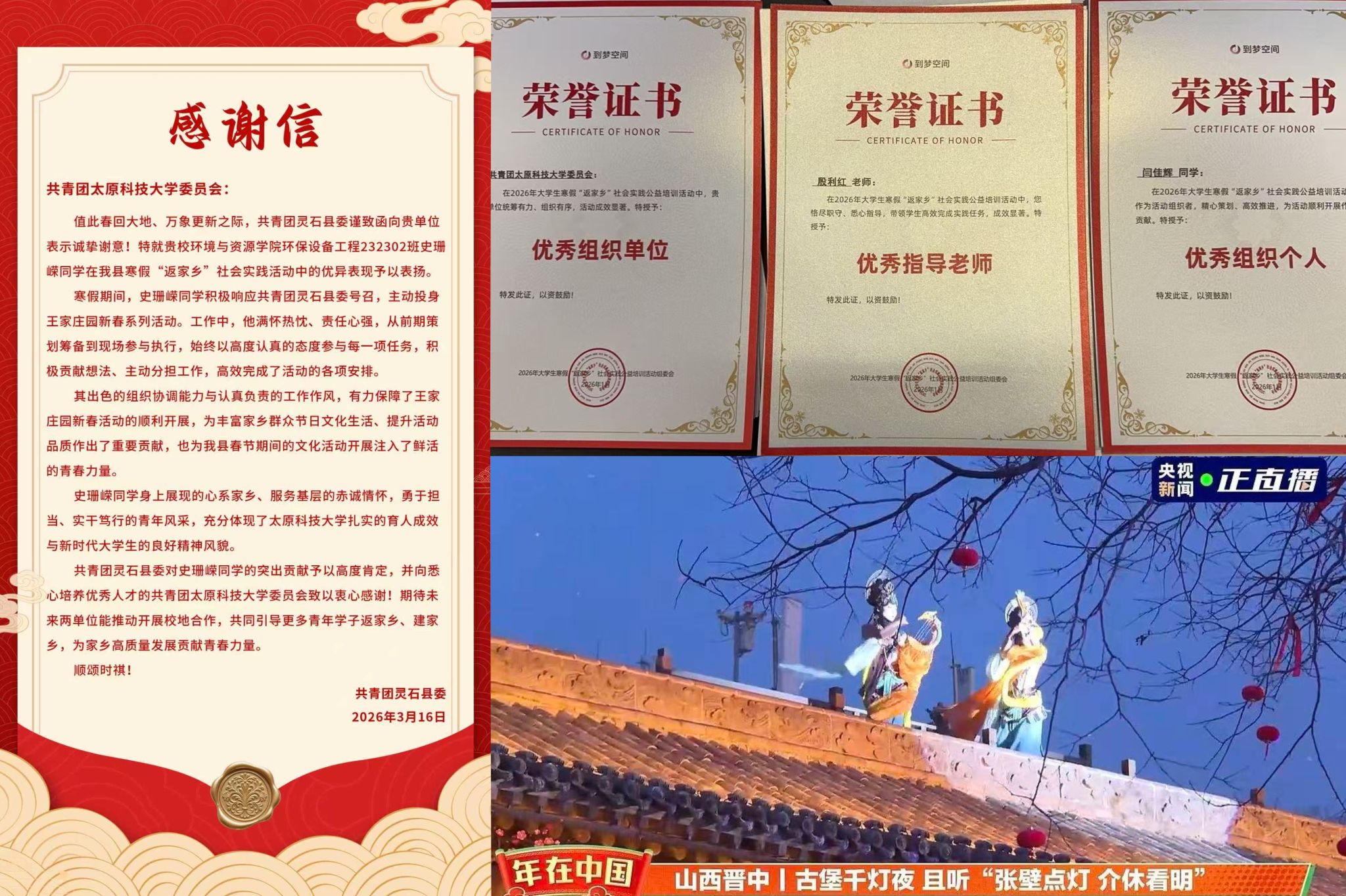 青春归乡筑梦,实干笃行致远。寒假期间,校团委紧扣立德树人根本任务,以党建为引领,精心组织“返家乡”社会实践活动,1500余名科大学子奔赴山西11个市区基层一线,在政务服务、社区治理、乡村振兴、文旅传承等岗位躬身实干,让青春与基层同频。此次实践硕果盈枝:校团委荣获2026年寒假“返家乡”社会实践优秀组织单位,1名指导教师和1名学生骨干分别获评优秀指导老师与优秀组织个人。