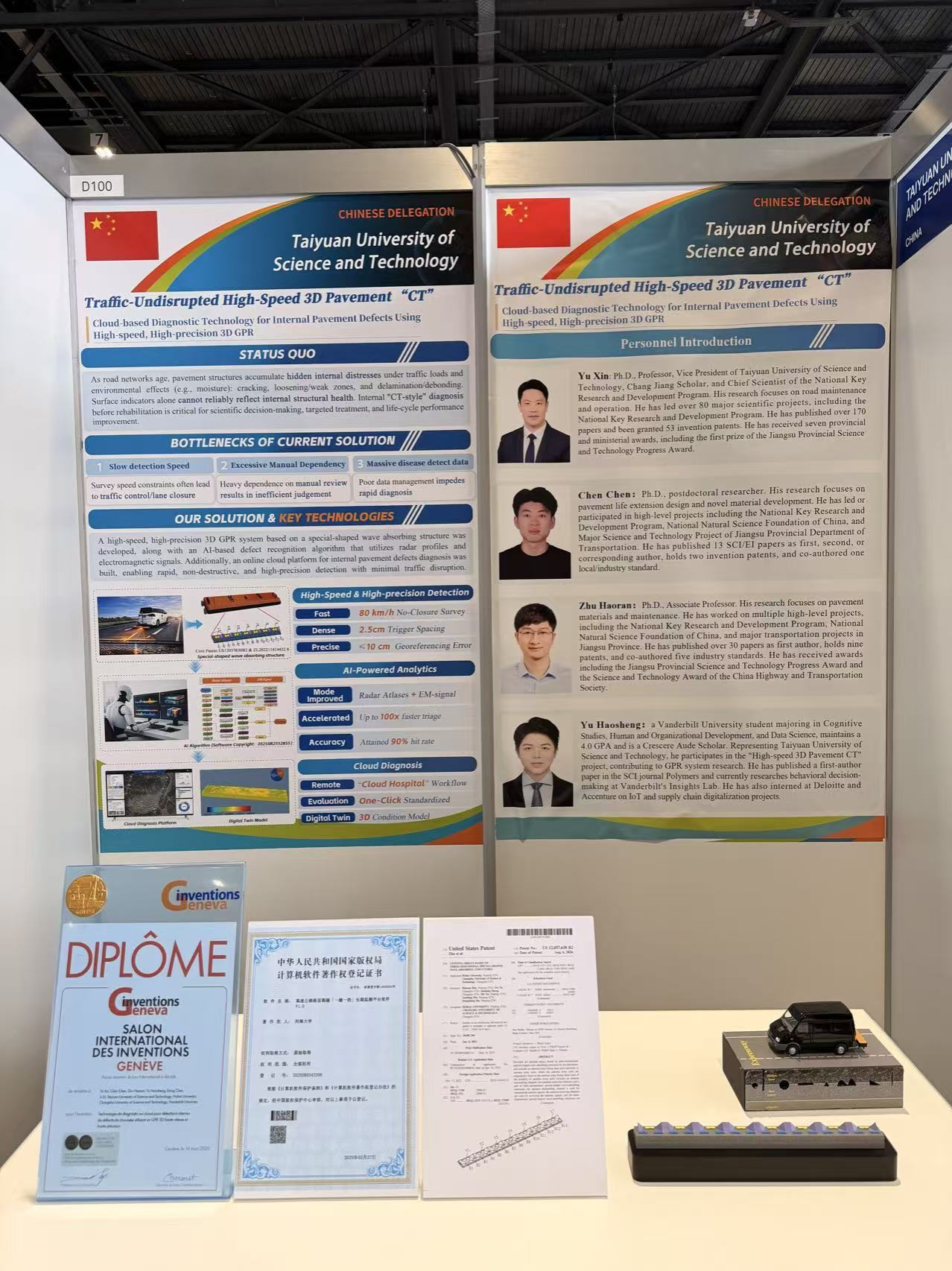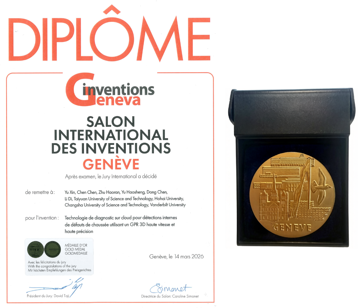 近日,第51届瑞士日内瓦国际发明展在日内瓦举行。best365官网学术副校长于新教授团队研发的“基于高速高精度三维探地雷达的道路结构内部病害快速诊断技术”,从来自全球35个国家和地区的1000多项发明中脱颖而出,荣获展会最高级别的“评审团特别嘉许金奖”,实现了我国在道路基础设施智能检测领域的又一重要突破。该成果依托国家重点研发计划项目(2021YFB2601200),围绕既有道路韧性提升中内部健康状况快速诊断的需求,以高速高精度三维探地雷达装备为核心,融合海量数据智能识别算法与云端协同诊断平台,构建了集“采集—识别—诊断”于一体的智能化检测技术体系。